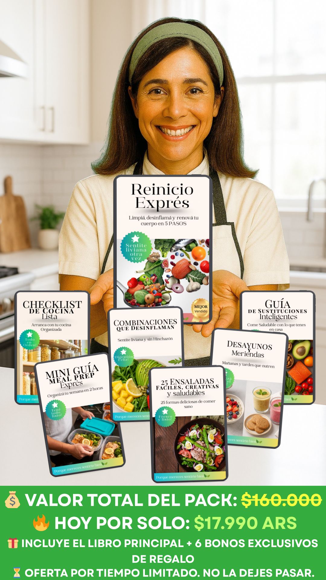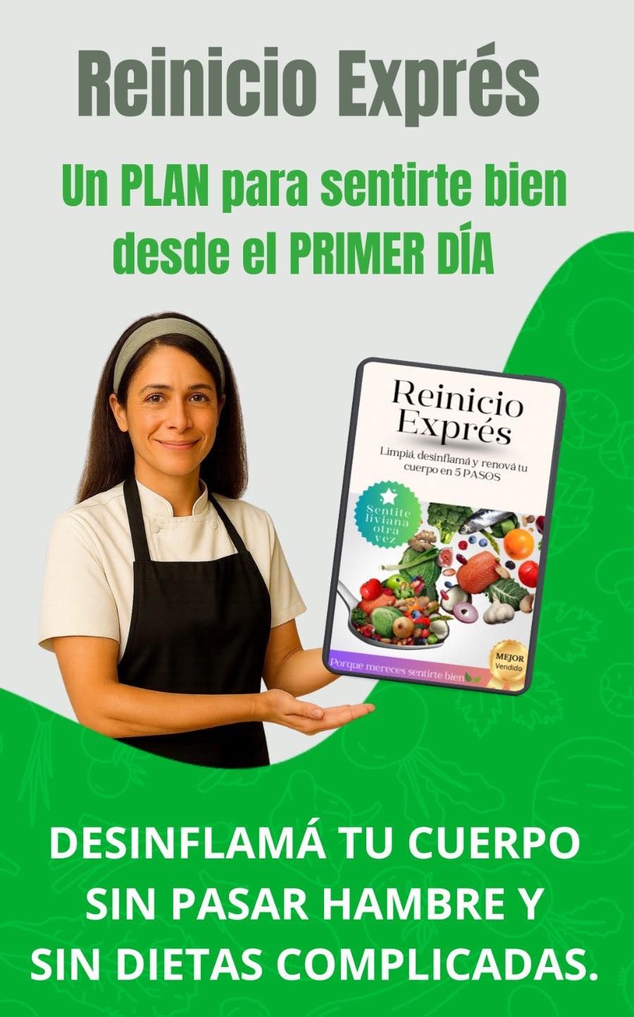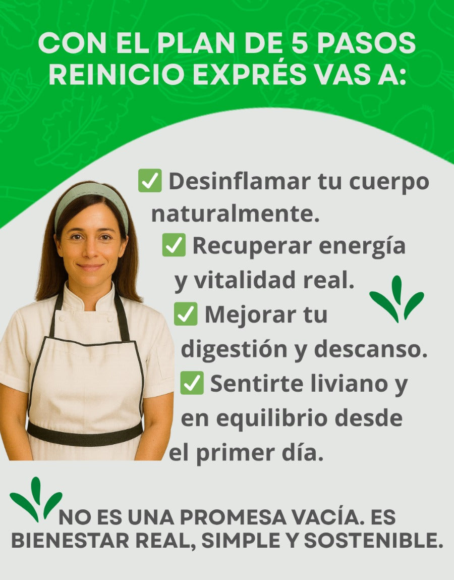 Es un plan de 5 pasos diseñado para desinflamar el cuerpo, equilibrar tu energía y volver a sentirte bien desde adentro. Incluye recetas simples, accesibles y deliciosas, con alimentos reales y sin restricciones extremas.